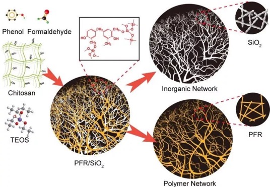 最近,中國科學技術大學俞書宏教授課題組以殼聚糖為三微軟模板,發展了一種酚醛樹脂(PFR)與SiO2共聚和納米尺度相分離的合成新策略,成功研制了具有雙網絡結構的PFR/SiO2復合氣凝膠材料。研究論文發表在Angew.Chem.Int.Ed.上,論文的第一作者是博士后于志龍。