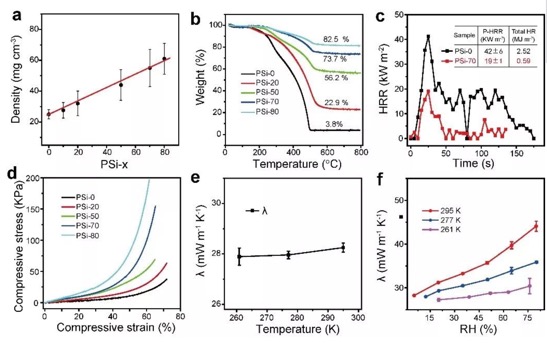圖3. PFR/SiO2復合氣凝膠的物理性能表征。(a)密度,(b)無機含量,(c)熱釋放速率,(d)力學壓縮曲線,(e)熱導率隨溫度變的化,(f)熱導率隨濕度的變化。