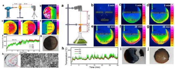 圖4. PFR/SiO2復合氣凝膠在噴燈火焰(左)和酒精燈火焰(右)下的隔熱阻燃效果。