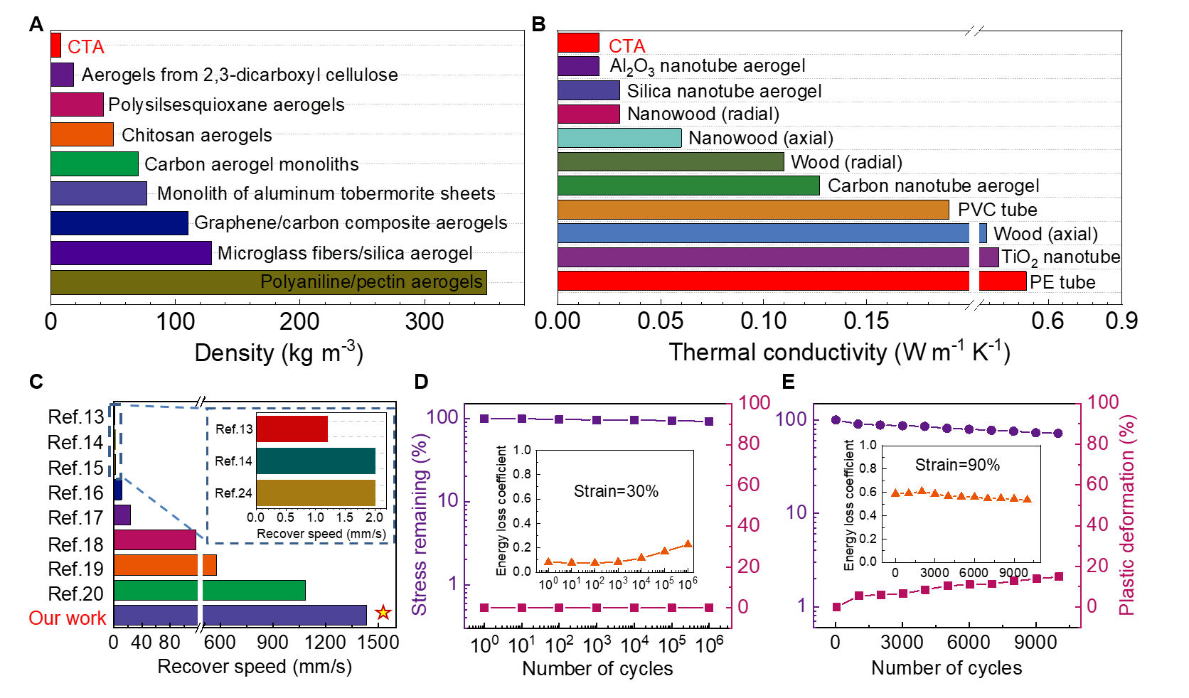 圖2. CTA的性能表征。(A)不同材料密度的對比;(B)不同材料熱導率的對比;(C)不同材料回復速度的對比;(D)CTA在壓縮形變為30%的條件下,壓縮一百萬次的機械性能變化;(D)CTA在壓縮形變為90%的條件下,壓縮一萬次的機械性能變化。